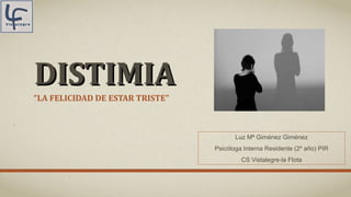 La distimia es un trastorno del estado de ánimo crónico caracterizado por un estado de ánimo deprimido durante al menos dos años, incluyendo síntomas como baja autoestima y fatiga. Históricamente, el término ha evolucionado desde su origen en la antigua Grecia, siendo diagnosticado en el contexto moderno como un trastorno afectivo menos severo que la depresión mayor. El tratamiento combina medicación antidepresiva y psicoterapia, aunque la adherencia al tratamiento puede ser un desafío.