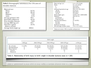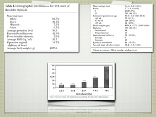 Este documento describe la distocia de hombros, definida como un parto que requiere maniobras de tracción de la cabeza fetal por más de 60 segundos debido a una discrepancia entre la cabeza fetal y la pelvis materna. Explica los factores de riesgo, las técnicas de tratamiento como las maniobras de primer, segundo y tercer nivel, y las posibles complicaciones fetales como lesiones del plexo braquial y fracturas de clavícula, y las complicaciones maternas como hemorragias.