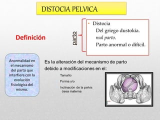 Este documento describe las distintas clasificaciones y tipos de distocias pélvicas que pueden ocurrir durante el parto. Se dividen en distocias morfológicas simétricas y asimétricas, causadas por la reducción de los diámetros del estrecho superior, medio e inferior; y distocias causadas por anomalías en la columna vertebral, caderas u otras extremidades que producen deformidades en la pelvis. Se explican los síntomas y riesgos asociados a cada tipo de distocia pélvica.