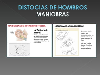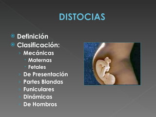 El documento clasifica las distocias o dificultades del parto en mecánicas, de presentación, de partes blandas, funiculares, dinámicas y de hombros. Describe los tipos de pelvis materna, la pelvimetría, y factores fetales como la macrosomía y desproporciones cefalopélvicas que pueden causar distocias. También explica distocias cuantitativas relacionadas a la contractilidad uterina anormal, como hipo e hiperdinamia, e distocias cualitativas como