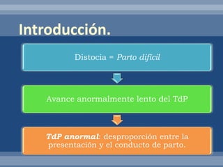 Este documento trata sobre distocias y partos difíciles. Brevemente resume tres puntos clave: 1) Las distocias son partos difíciles causados por anomalías mecánicas del pasajero, las potencias expulsivas o el conducto de parto. 2) Existen varios tipos de anomalías que pueden causar distocias, como disfunción uterina, desproporción cefalopélvica o presentación anormal del feto. 3) El diagnóstico y tratamiento de distocias depende del tipo y grado de anomalía presente.