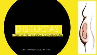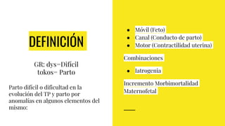 Este documento describe varios tipos de distocias o dificultades en el parto, dividiéndolas en cuatro categorías: 1) distocias de contracción, 2) distocias por alteraciones del canal de parto, 3) distocias de origen fetal y 4) distocias por iatrogenia. Dentro de cada categoría, explica los diferentes tipos de distocias, sus causas, diagnóstico y tratamiento. El documento provee una clasificación completa de las posibles dificultades que pueden ocurrir durante el parto y las estrategias