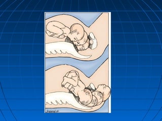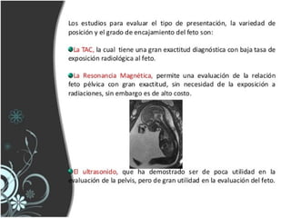 Este documento describe diferentes tipos de malpresentaciones fetales como la presentación de nalgas (podálica), presentación de hombros, presentación compuesta y factores asociados. También discute el diagnóstico y manejo de distocias de hombros donde el hombro anterior se impacta detrás de la sínfisis pubiana tras el nacimiento de la cabeza, aumentando la morbilidad y mortalidad materna y fetal.
