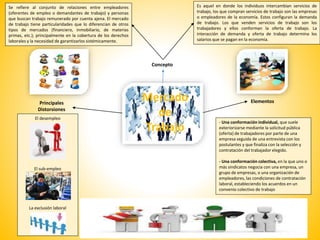 El documento describe el mercado de trabajo, incluyendo conceptos como la demanda y oferta de trabajo, y las formas en que los individuos interactúan para obtener empleo. También analiza distorsiones como el desempleo, subempleo y exclusión laboral, sus causas y consecuencias. Explica que el mercado de trabajo es donde los individuos intercambian servicios laborales y donde la interacción entre demanda y oferta determina los salarios.