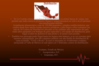 La Costeña cuenta con una sólida red de distribución que abarca más de 150,000 establecimientos en México e internacionalmente, gracias a más de 30 centros de distribución estratégicamente ubicados. También dispone de una flotilla de venta a bordo en 10 ciudades, incluyendo el Valle de México, para alcanzar tanto a consumidores cercanos como lejanos. Sus productos se distribuyen a través de diversos canales, incluyendo grandes cadenas como Walmart y Soriana, así como intermediarios y tiendas pequeñas que adaptan sus métodos de transporte a sus necesidades específicas.