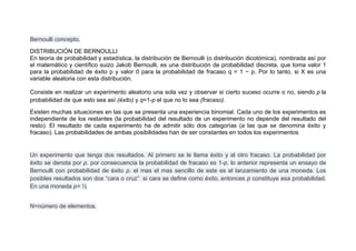 El documento detalla varias distribuciones de probabilidad, incluyendo Bernoulli, binomial, Poisson, normal y gamma. Explica cada tipo de distribución, sus características, fórmulas y aplicaciones en situaciones reales, destacando la importancia de la probabilidad y la estadística en la modelización de fenómenos aleatorios. Además, abarca ejemplos prácticos y conclusiones sobre regularidad estadística y comportamiento aleatorio.