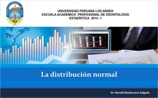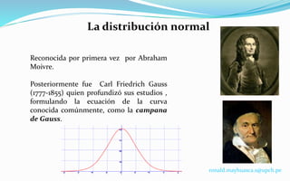 El documento describe la distribución normal y sus propiedades. La distribución normal es una curva en forma de campana que depende de dos parámetros: la media y la desviación estándar. La desviación estándar determina qué tan dispersos están los datos alrededor de la media, mientras que la media indica la posición de la curva a lo largo del eje horizontal. Existen distribuciones normales estándar donde la media es 0 y la desviación estándar es 1, lo que permite calcular probabilidades asociadas a los valores de una variable.