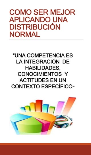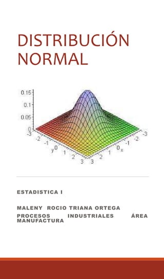 El documento proporciona información sobre la distribución normal estadística. Explica que es una de las distribuciones más utilizadas en estadística y tiene forma de campana. Presenta objetivos de la distribución normal como entender conceptos de variables aleatorias continuas y saber calcular probabilidades. También incluye ejemplos y ejercicios sobre cómo aplicar la distribución normal para calcular probabilidades en diferentes contextos como pesos de productos, alturas de estudiantes y tiempo de sintonía de radioescuchas.