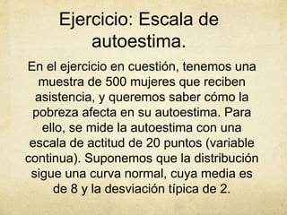 El documento describe un estudio que mide la autoestima de 500 mujeres usando una escala de 20 puntos. La media de la muestra es de 8 puntos y la desviación típica es de 2 puntos. Se usa una distribución normal para modelar los datos. El resumen calcula la probabilidad de que una mujer seleccionada al azar obtenga una puntuación de 10.5 o menos en la escala, usando tablas de distribución normal y tipificando la variable. El resultado es una probabilidad de 0.8944.