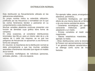 Este documento describe la distribución normal y el muestreo. Explica que la distribución normal es común en fenómenos naturales donde muchos factores pequeños influyen en un resultado. También describe métodos de muestreo como el aleatorio simple, estratificado y por conglomerados, los cuales eligen participantes de manera aleatoria para que la muestra sea representativa de la población total.
