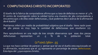 El dueño de una fábrica de computadoras afirmó que su tasa de defectos era menor al 0.3%. Sin embargo, un estudio de una muestra de 360 computadoras encontró que 2 estaban defectuosas, lo que representa un 0.55% de defectos. Al aplicar una distribución binomial, la probabilidad de que salieran 2 piezas defectuosas de 360 es de 19.83%, por lo que la afirmación del dueño de que la tasa de defectos es del 0.3% está equivocada.