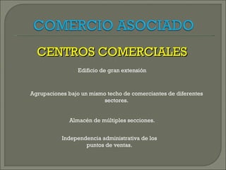Este documento describe diferentes tipos de centros comerciales, incluyendo centros temáticos especializados, centros de barrio, centros urbanos regionales, mercados municipales y supermercados. También discute las ventajas e inconvenientes de los centros comerciales, como la reducción de costos pero también la pérdida de independencia de los comerciantes. Finalmente, explica brevemente las asociaciones de comerciantes y las centrales de compras.