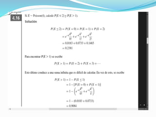 Este documento describe diferentes distribuciones de probabilidad como la Bernoulli, binomial, Poisson y exponencial. Incluye conceptos, fórmulas y ejemplos de cada una. También presenta problemas de probabilidad para practicar el cálculo de variables aleatorias con estas distribuciones.