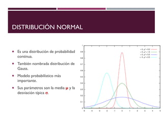 El documento describe la distribución de probabilidad normal, también conocida como distribución de Gauss, y sus características fundamentales como la media, moda y mediana que coinciden en el máximo de la curva. Se explica la distribución normal reducida, el cálculo del puntaje z, y se presentan ejemplos prácticos utilizando el teorema del límite central para determinar probabilidades en muestras de edad. Finalmente, se calcula la probabilidad de ciertos rangos de edad y el número estimado de estudiantes dentro de un grupo, ilustrando aplicaciones prácticas de la teoría.