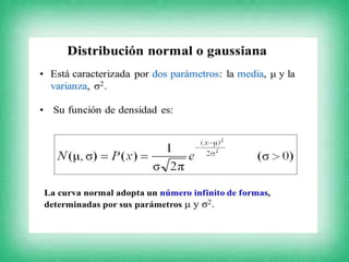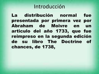La distribución normal describe una curva en forma de campana que es simétrica respecto a su media. Fue presentada por primera vez por Abraham de Moivre en 1733 y se usa comúnmente para modelar fenómenos reales donde muchos factores pequeños influyen en un resultado. Aunque los datos no siempre siguen una distribución normal, estadísticos calculados sobre muestras a menudo sí.