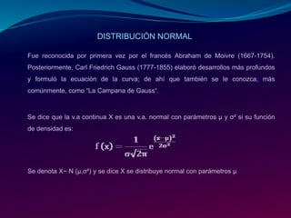 1) La distribución normal, descrita por Gauss, que tiene forma de campana y depende de los parámetros media y desviación estándar.
