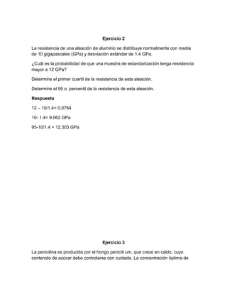 Este documento presenta 5 ejercicios que involucran distribuciones normales y sus aplicaciones. Los ejercicios calculan probabilidades, percentiles y ajustan parámetros de distribuciones para optimizar procesos basados en especificaciones de calidad.