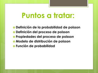 1) La probabilidad de Poisson describe eventos aleatorios independientes que ocurren continuamente en el tiempo o espacio. 2) Un proceso de Poisson implica eventos aleatorios que ocurren en intervalos continuos de tiempo o regiones. 3) La distribución de Poisson se aplica cuando se realizan muchos experimentos binomiales con una probabilidad de éxito baja y un número grande de pruebas.