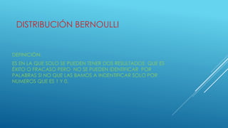 Este documento presenta diferentes tipos de distribuciones de probabilidad como la Bernoulli, binomial, Poisson y exponencial. Explica que la distribución Bernoulli solo tiene dos resultados posibles representados por números, la binomial cuenta el número de éxitos en una secuencia de ensayos independientes, la Poisson expresa la probabilidad de eventos en un tiempo dado con una frecuencia media conocida y la exponencial estudia el tiempo entre llegadas con una tasa constante. También incluye ejemplos y problemas para cada distribución.