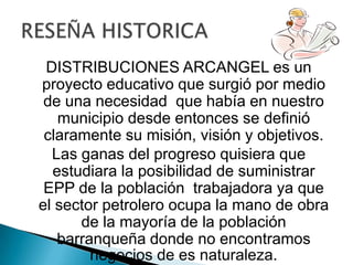 DISTRIBUCIONES ARCANGEL es un proyecto educativo que surgió para suministrar equipos de protección personal a la población trabajadora del sector petrolero en Barranca de Upía, con la misión de satisfacer las necesidades de los clientes de manera responsable y competitiva y la visión de ser la mejor empresa en el suministro de dotaciones en la región.