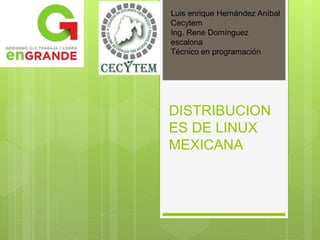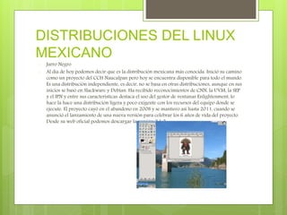 Este documento presenta una lista y breve descripción de varias distribuciones de Linux desarrolladas en México, incluyendo Jarro Negro, Aldos, Aztli Linux, Aztec OS, Beak OS, Orvitux, TM Linux, Ikim Linux, Vacteria y Kodex. Las distribuciones varían en su enfoque, entornos de escritorio y estado de desarrollo, con algunas aún activas y otras abandonadas. La mayoría están disponibles para su descarga gratuita.