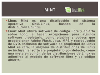 Linux Mint es una distribución de Linux basada en Ubuntu que utiliza principalmente software de código abierto, aunque incluye algunos programas propietarios como Adobe Flash. Debian es una distribución mantenida por desarrolladores y usuarios que empaqueta software libre para múltiples arquitecturas, mientras que Ubuntu se basa en Debian y ofrece actualizaciones simultáneas de aplicaciones a través de repositorios.