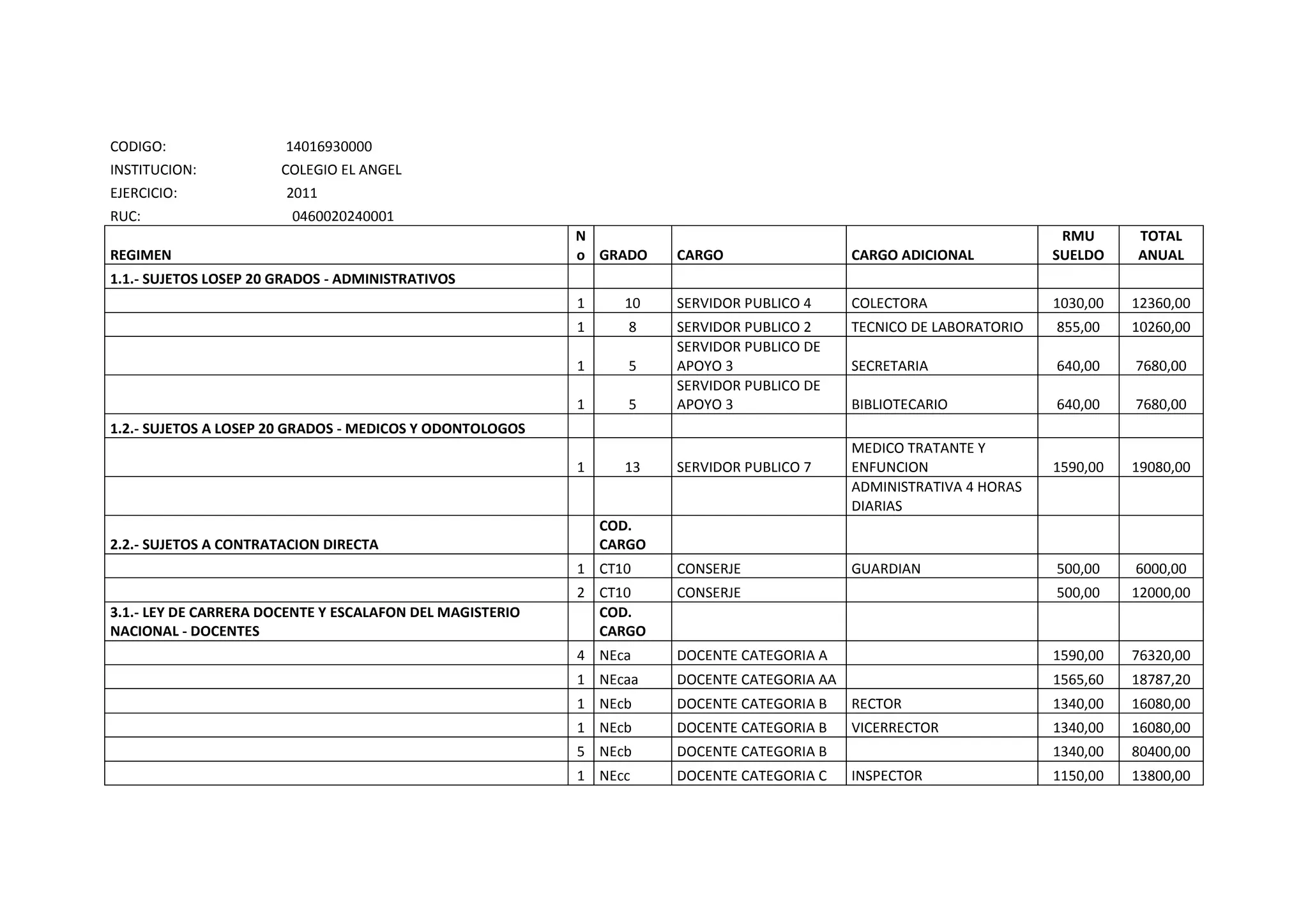Este documento presenta la nómina de personal de un colegio para el año 2011, dividiéndolos en diferentes regímenes y categorías. En total había 8 funcionarios, incluyendo servidores públicos administrativos y médicos, conserjes contratados directamente, docentes de diferentes categorías según la ley de carrera docente y docentes contratados, así como un jornalero contratado bajo el código de trabajo.