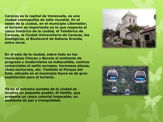 Caracas, la capital de Venezuela, es una ciudad cosmopolita con varios lugares turísticos importantes como el casco histórico, el Teleférico de Caracas, y los Zoológicos. En el este de la ciudad hay centros comerciales y plazas modernas, mientras que en el sureste se encuentra el pequeño pueblo colonial de El Hatillo. El Ávila, una montaña cercana a Caracas, ofrece atracciones como el Parque Ávila Mágica y el Hotel Humboldt. Caracas también tiene una vibrante cultura con museos