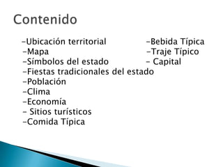 El documento resume información sobre el Distrito Capital de Venezuela. Incluye detalles sobre su ubicación, extensión, símbolos, capital (Caracas), división política, población, clima tropical, economía basada en los servicios financieros y el turismo, platos típicos como el pabellón criollo y la bebida cocada, y fiestas tradicionales como el carnaval y la burriquita.