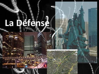 El documento describe La Défense, un distrito de negocios en París. Explica que La Défense se ubica entre los municipios de Puteaux, Courbevoie y Nanterre, y que tiene una gran influencia económica en París y Europa al generar más de 150,000 empleos. También discute el impacto histórico, social, económico y ambiental de La Défense en el contexto, incluyendo cómo alteró el suelo pero ahora intenta ser más sostenible. Finalmente, presenta imágenes de varios rascac