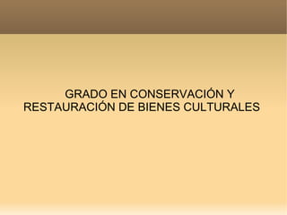 Este documento contiene información sobre las notas de corte para el grado en Conservación y Restauración de Bienes Culturales en diferentes universidades españolas. También incluye los parámetros de ponderación de las asignaturas del plan de estudios y posibles salidas profesionales en la conservación y restauración del patrimonio cultural.