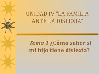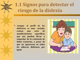 Este documento trata sobre la dislexia y cómo los padres pueden ayudar a un hijo con dislexia. Primero, explica algunos signos que pueden indicar dislexia, como dificultades con la lectura y escritura a pesar del esfuerzo. Luego, ofrece consejos para los padres como mantener comunicación con maestros, ayudar a organizar el tiempo y materiales escolares, y crear un entorno estable y de apoyo en el hogar.