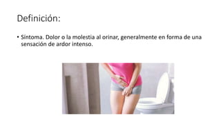 La disuria se refiere al dolor o molestia al orinar, generalmente como una sensación de ardor intenso. Es más común en mujeres debido a infecciones del tracto urinario inferior como cistitis o uretritis, y en varones puede ser causado por prostatitis. La disuria se produce por la irritación del trígono vesical o la uretra, causando dolor e inflamación durante la micción. Puede ser resultado de infecciones, como cistitis o uretritis, o de condiciones como prostatitis, cálculos renales, esten