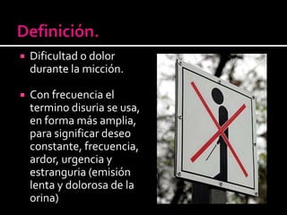 La disuria se refiere a la dificultad o dolor al orinar. Se produce cuando hay lesiones inflamatorias en la pared vesical que causan sufrimiento, especialmente en el trígono durante la micción. La urgencia se debe a la irritación de la uretra posterior o el trígono por inflamación, cálculos o tumores. Las causas más comunes de disuria incluyen infecciones del tracto urinario, cálculos renales, hiperplasia benigna de próstata y cáncer de vejiga o próstata. La evaluación