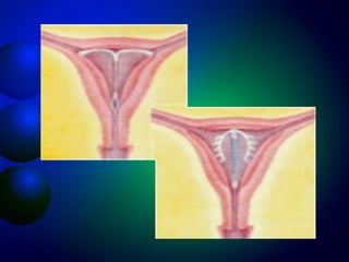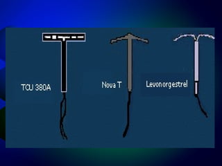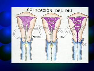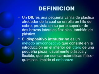 El documento describe la historia y tipos de dispositivos intrauterinos (DIU). Explica que un DIU es un método anticonceptivo que se inserta en el útero para prevenir el embarazo. Se han desarrollado varias generaciones de DIU a lo largo de la historia, desde los primeros modelos de plástico hasta los modernos que liberan hormonas o iones de cobre. Actualmente, los DIU más comunes son los portadores de cobre o de hormonas como la levonorgestrel.