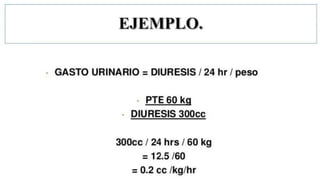 La diuresis normal se refiere al flujo de orina entre 1200 y 1500 ml por día, dependiendo de la cantidad de fluido ingerido. La diuresis normal debe ser superior a 0,5 ml por kg por hora. El documento proporciona información sobre la cantidad normal de orina producida cada día y la tasa normal de producción de orina por peso corporal y hora.
