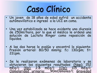 Un joven sufrió un accidente automovilístico y presenta una diuresis de 250 ml/hora. Sus exámenes muestran niveles altos de sodio y cloro séricos y una osmolaridad urinaria baja de 90 mOsmoles/l, indicando una diuresis hídrica debido a una inhibición de la secreción de la hormona antidiurética (ADH).