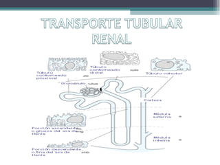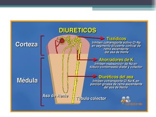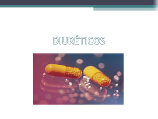 Este documento describe las características de los diferentes segmentos del túbulo renal y su papel en la reabsorción de sodio, potasio, calcio y agua. También explica los mecanismos de acción de los diuréticos, clasificándolos en diuréticos de asa, tiazidas y ahorradores de potasio. Se detallan sus efectos farmacodinámicos, indicaciones terapéuticas, efectos adversos e interacciones.