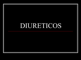 Este documento describe los diferentes tipos de diuréticos, incluyendo su mecanismo de acción, indicaciones y efectos adversos. Explica cómo los diuréticos actúan inhibiendo la reabsorción de sodio y agua a nivel del túbulo contorneado proximal, asa de Henle y túbulo contorneado distal, aumentando la diuresis. Los principales tipos de diuréticos discutidos son los inhibidores de la anhidrasa carbónica, los osmóticos, los diuréticos del asa, los tiaz