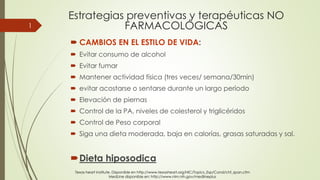 El documento proporciona estrategias preventivas y terapéuticas no farmacológicas para el tratamiento del edema. Recomienda cambios en el estilo de vida como evitar el consumo de alcohol y tabaco, mantener actividad física regular, controlar la presión arterial y los niveles de colesterol, y seguir una dieta baja en sal, grasas y calorías. También recomienda estrategias como drenaje linfático manual, vendajes compresivos y cinesiterapia para el tratamiento del linfedema.