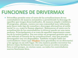 DriverMax es un asistente que permite detectar y descargar automáticamente las actualizaciones más recientes de los controladores instalados. Ofrece copias de seguridad fáciles de recuperar y una comunidad para hacer consultas. Permite comprobar actualizaciones, identificar dispositivos desconocidos y crear informes de hardware.