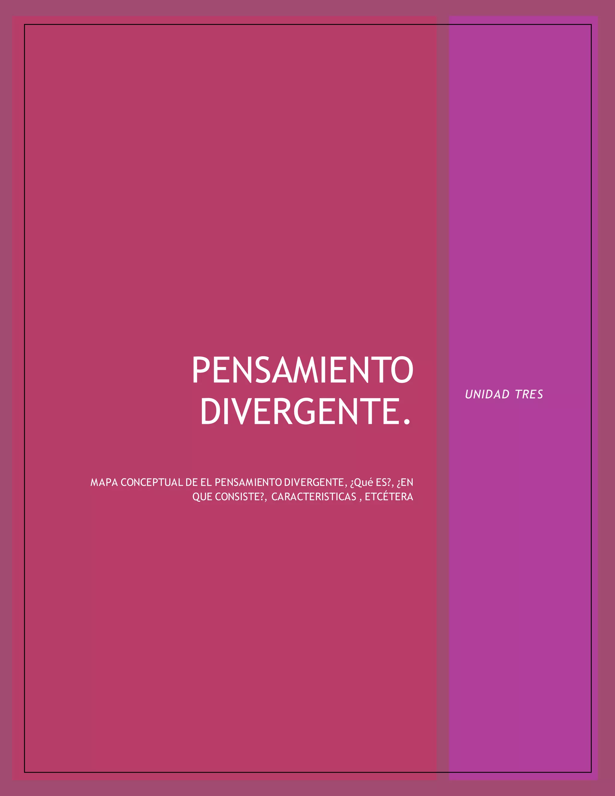 El pensamiento divergente es un proceso mental que genera ideas creativas explorando todas las posibles soluciones a una situación. Se caracteriza por desarrollar ideas de manera flexible analizando múltiples puntos de vista y manteniendo los hábitos de pensamiento cambiantes. El objetivo principal es ser capaz de analizar diversas perspectivas de un problema y desarrollar posibilidades mediante formas variadas para expandir las opciones disponibles.