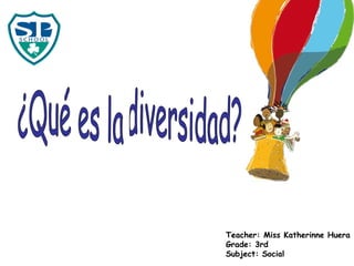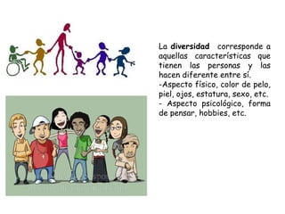 El documento define la diversidad como las características que hacen a las personas diferentes entre sí, tanto físicas como psicológicas. La diversidad cultural se refiere a las características que hacen distintas a las culturas de diferentes países o grupos, como el idioma, la comida y las tradiciones. Existe diversidad cultural en Chile debido a los pueblos originarios que habitaban el país antes de la llegada de los españoles y que aportaron palabras y comidas a la cultura chilena, así como por el mestizaje y la inmigración