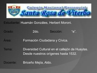 El documento resume aspectos clave de la cultura Huari, incluyendo su ubicación en los Andes centrales cerca de Ayacucho, su economía basada en la ganadería y agricultura, y su sociedad jerarquizada con una población entre 10,000 a 20,000 habitantes. También menciona a Inés Huaylas, una mujer criada en la corte inca que regresó a su pueblo natal de Tocash en Huaylas luego de la muerte del Inca, y destaca la importancia arqueológica de la cultura Huari como