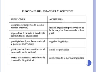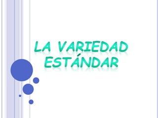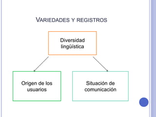 Este documento describe la diversidad lingüística en términos de variedades geográficas, históricas, generacionales y sociales de diferentes lenguas como el castellano, catalán, gallego y euskera. Explica que las variedades no dependen solo de factores fonéticos sino también de factores sociales, políticos y culturales. Además, describe la función de la variedad estándar como un modelo que facilita la comunicación entre hablantes y su evolución a través de los medios de comunicación.