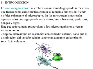 Este documento describe los conceptos básicos de la microbiología. Explica que los microorganismos son seres vivos de pequeño tamaño que incluyen bacterias, virus, hongos, protozoos y algas. Detalla los métodos para cultivar, aislar e identificar microorganismos, como el uso de medios de cultivo, tinción, pruebas bioquímicas y técnicas moleculares. También resume brevemente la estructura, clasificación y ciclo de vida de los virus, así como conceptos sobre bacterias, viroides, pr