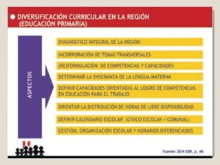 De acuerdo con el artículo 33 de la Ley General de Educación, los currículos básicos nacionales se diversifican en las instancias regionales y locales para responder a las características de los estudiantes y del entorno de cada región. El documento explica que la diversificación curricular se concreta en el Proyecto Curricular Institucional elaborado por cada institución educativa.