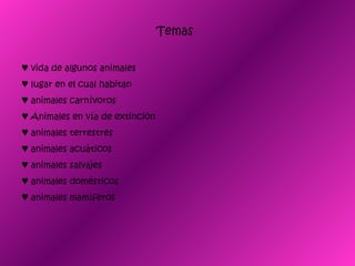 Este documento resume diferentes tipos de animales, incluyendo aves de presa como el águila, animales carnívoros, animales en peligro de extinción, animales terrestres, acuáticos, salvajes y domésticos. También describe brevemente las características de los mamíferos.