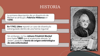 El divertículo de Meckel es una malformación congénita del intestino delgado resultante del cierre incompleto del conducto omfalomesentérico, afectando aproximadamente al 2% de la población, siendo más frecuente en niños. El diagnóstico generalmente se realiza en la infancia, y las complicaciones más comunes incluyen obstrucción intestinal y hemorragia. El tratamiento preferido es la resección quirúrgica, especialmente en pacientes asintomáticos encontrados incidentalmente.