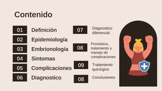 El divertículo de Meckel es una anomalía congénita del intestino delgado que ocurre en aproximadamente el 2% de la población. Se localiza generalmente a 60 cm de la válvula ileocecal y puede causar complicaciones como hemorragia o obstrucción. El diagnóstico se realiza principalmente mediante estudios de imagen como ultrasonido o gammagrafía con tecnecio-99m, y el tratamiento es quirúrgico a través de diverticulectomía o resección intestinal.